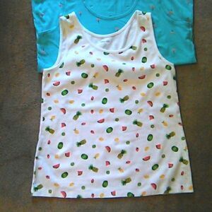 Two cute tanks. A medium and a large. Basic Editions L : Turquoise with flamingos, measures 42 at chest, 48 at bottom hem, 25 long. Lands' End M: fruit salad, measures 38 at chest, 45 at bottom hem. 25 long. Two great choices for warm weather.