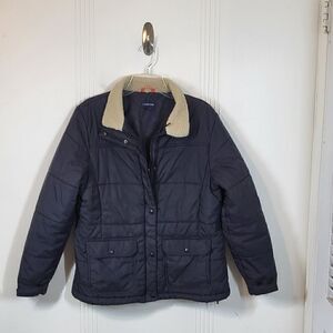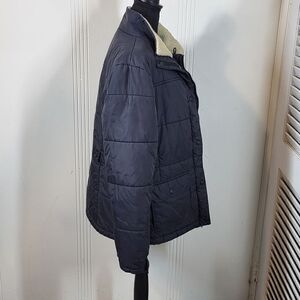 Land's End women's black jacket. Size 14-16. Zips up & snaps in the front. Drawstring at the bottom of the jacket. Two inside pockets.