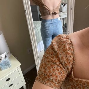 Lane 201 (Endless Blu) Cropped Tan Floral Top with Tie Back Large