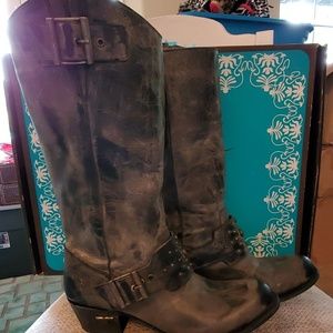 LAST ONES! Gray distressed looking. Wide strap with buckle over instep. Strap and buckle at top of shaft. Super cute boot.