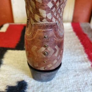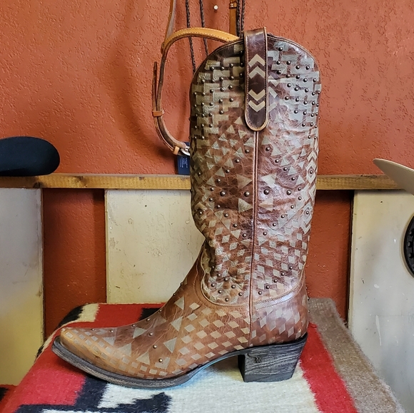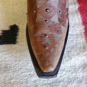 Gorgeous soft distressed leather. Tone on tone Diamond & Triangle Design. Hand studded embellishments. Snip toe. Fully Leather Lined. Leather sole. Arch support for added comfort.