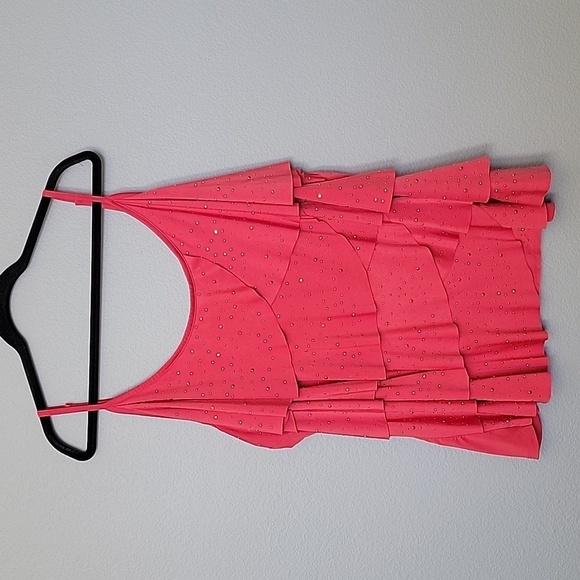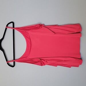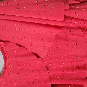 Color is a pinkish-orange. Heavy stretch fabric plus size tank top. Adjustable straps. Gold embellishments all over the front. There is 1 missing stud at the chest, see close up. Gorgeous, sparkly top! Dopamine, bling, dressy, brunch, party, office, going out, feminine, flirty, statement, eye catching, vibrant, colorful, costume, curvy, plus, fierce