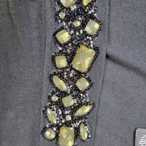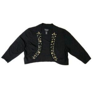 This is a Lane Bryant women's 14/16 shrug cropped cardigan ¾ sleeve sweater open front with sparkly large beads, sequins, and mesh accents on the front. It is in excellent condition.