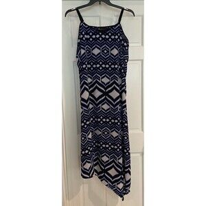 Elevate your casual wardrobe with this stunning Lane Bryant Overall Dress. The dress comes in a beautiful shade of blue and features a geometric pattern with strappy sleeves and an asymmetrical hem. It is made of high-quality polyester and chiffon fabric, making it comfortable to wear all day long.