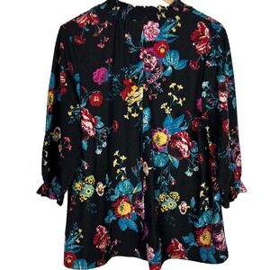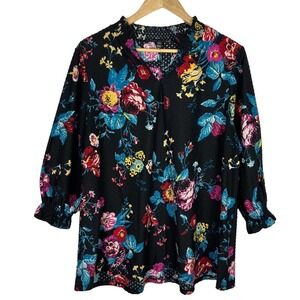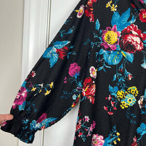 Beautiful Lane Bryant 18/20 Clip Dot Black Blouse w Red, Yellow & Blue Flowers