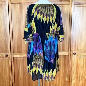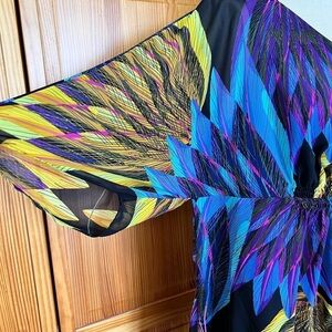 Tags- plus size, vibrant, colorful, artsy, modest, sheer, flow, Boho, bohemian, V-neck, smocked