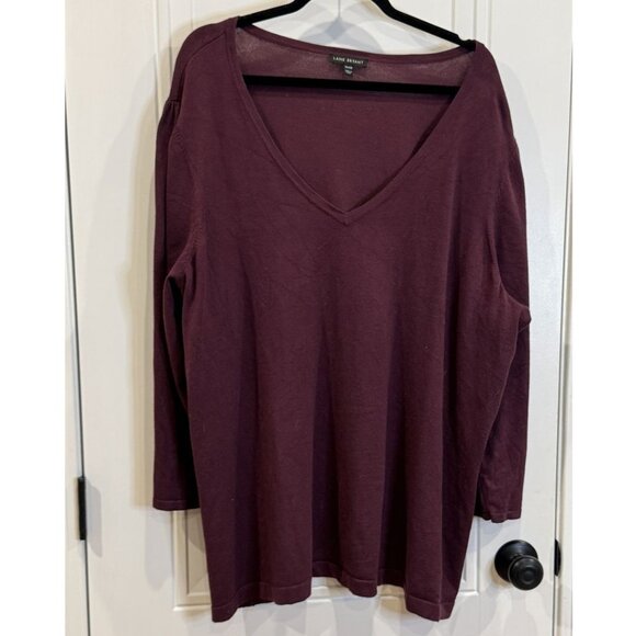 Add a pop of color to your wardrobe with this Lane Bryant v-neck top in a burgundy shade. The 26/28 plus size fit and soft rayon/polyester blend make it both comfortable and flattering, perfect for layering or wearing on its own. Features a classic v-neckline and long sleeves in a lightweight knit. Great for layering! Excellent used condition Approximate measurements: 29 in. armpit to armpit; 29 in. length. Please ask all questions prior to purchase.