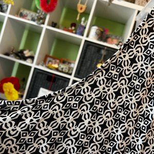 Soft and comfortable black and white patterned top with black lace trim at the neck and hem. Pre-owned, good condition with no major defects. Selling cheap because I know how hard it is to find plus size affordable clothes. This item has been worn. Smoke and perfume free, pet friendly home.