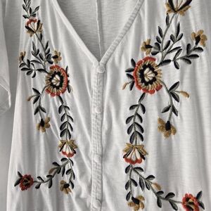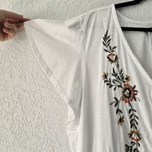 Womens plus size 30/32 white short sleeve ruffle top with colorful floral embroidery and a v neckline. Cotton blend fabric. EUC no flaws.