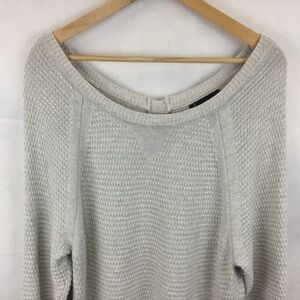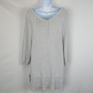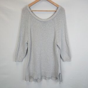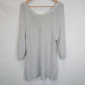 Lane Bryant knit sweater minimalist capsule wardrobe. Light gray. Button detailing on back. 3/4 Sleeve. Small slits on the sides. High-low hem.Size 14/16.