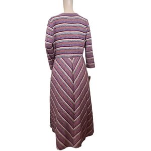 Shine in stripes with this pretty ribbed midi dress featuring a faux-wrap bodice and a colorful print.