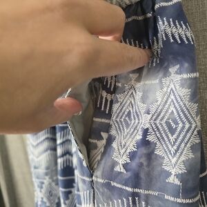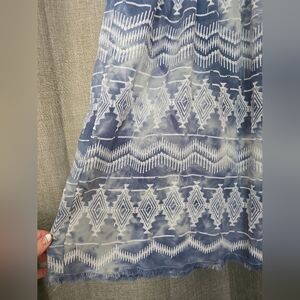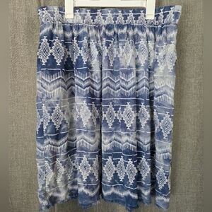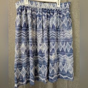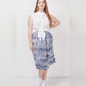 This beautiful Lane Bryant skirt is perfect for any bohemian or beach themed outfit. The blue geometric pattern and embroidered accents add a touch of elegance to the raw hem and skater style. The plus size and elastic waist make it a comfortable and flattering fit for any woman, while the pockets and lining add practicality to the skirt. Ideal for any occasion, this midi skirt is a must-have for any fashionista.