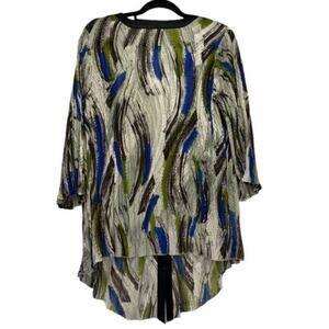 Women's multicolor abstract overpiece from Lane Bryant. Blue, green, white and black. Beautiful crinkled fabric, 3/4 bell sleeves. Black trim is a soft, velvety material. Front has a one button closure. Front hem is longer than the back. Size 14/16. Due to light & screen variations, colors may vary slightly from the images