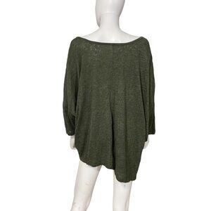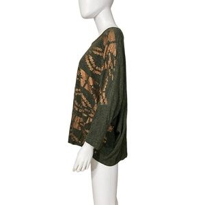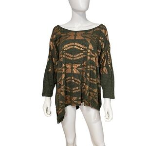 Lane Bryant top in a heather green with a metalic copper Aztec print on the front. It has an asymmetrical hem and a scoop neckline. It has dolman sleeves. Sleeves are about 3/4 length. It is a loose fitting top.