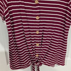 Elevate your style with this chic striped berry button-down top. Perfect for casual outings, this top features a flattering fit and a stylish tie-front detail.