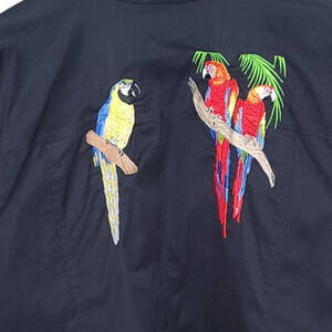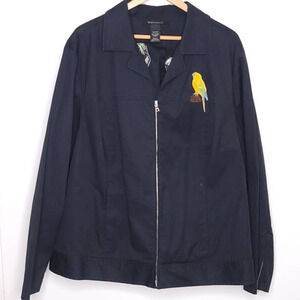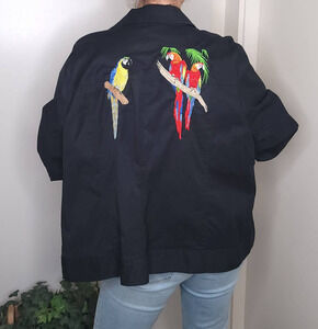 Lane Bryant Black Cotton jacket has Parrot embroidery on the front area and some on the back. Very flattering comfortable jacket! Excellent condition. 2 usable pockets in front, front zipper closure, and zippers at the sleeve hems