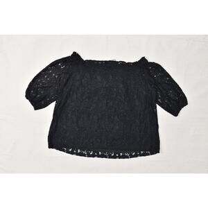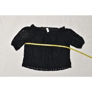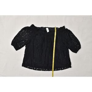 This stylish Lane Bryant women's black lace top is perfect for any occasion. The off-shoulder design and puff sleeves add a touch of elegance, making it a versatile piece for your wardrobe. The top is a plus size 26/28, with an armpit-to-armpit measurement of approximately 30 inches and a length of 21 inches from shoulder to hem. It is made from a blend of nylon, cotton, and spandex with a polyester lining, providing a comfortable and flattering fit. The black color and floral lace pattern make it a classic piece that can be dressed up or down. Whether you're going out for a casual day or a special evening, this top is a great choice. It is in excellent used condition with no visible signs of wear, stains, or tears. Please refer to the images for detailed measurements and condition. This top is a great addition to any collection.