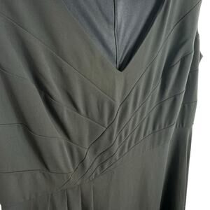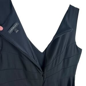 Excellent preowned condition. Black V-Neck sleeveless asymmetrical hem lined midi dress. Has pleating on right side of waist. Zips up back. Polyester/spandex material. Approx. measurements: Shoulder to hem 40-44", pit to pit 21", waist across. Size 14.