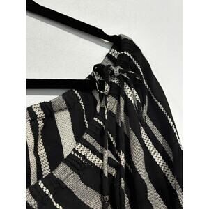 This Lane Bryant black and tan off shoulder top with adjustable shoulder / neckline and accent ties in size 26 is a stylish and comfortable choice for a boho, beachy look. Made from a cotton blend material, it features a striped pattern, 3/4 flutter sleeves, and an off the shoulder neckline with a bow accent. Perfect for travel or casual outings, this blouse offers a trendy and colorful vibe for women who wear plus sizes.