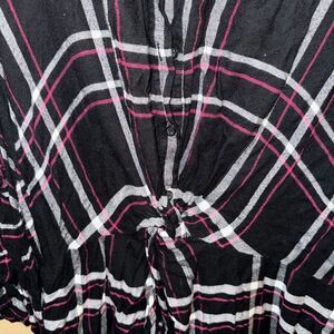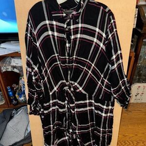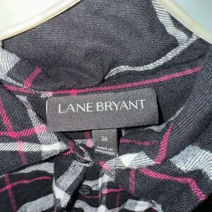This Lane Bryant shirt features a distinctive black and white plaid pattern with 3/4 sleeves with a pink detail, tie sinch design on front. Comes from a smoke free home.