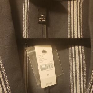 This is a NWT Lane Bryant shawl collar striped blazer in size 26. This blazer is perfect for adding a professional touch to any outfit. The striped pattern is eye-catching and the shawl collar adds a touch of sophistication.