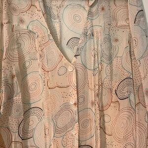 This Lane Bryant blouse in a soft cream tone features a beautifully multicolored circular print for a polished, modern business casual look. The lightweight sheer fabric offers effortless drape and comfort, with 3/4 sleeves and a relaxed silhouette that pairs perfectly with office trousers, denim, or layered looks. Perfect for workdays, weekend outings, or transitional seasonal wear.
