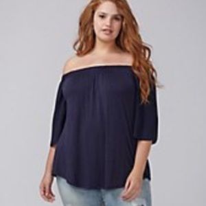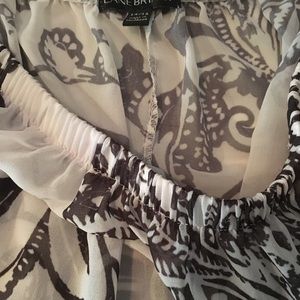 Lane Bryant Brown and Off White Elastic Neckline off the Shoulder Sheer, Flowy Top. 100% Polyester. Size 14/16 Armpit to Armpit 26" Sleeve Length 24" Elastic Neckline 16.5". Like New Condition.
