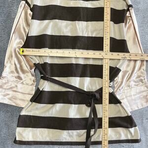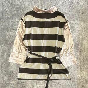 - Unique layered-look top with satin button-up shirt sleeves and collar sewn into a brown and beige striped knit vest. Gives the illusion of a layered outfit in one piece. Super early 2000s business casual meets preppy chic. ribbon tie at the waist add feminine detail.
