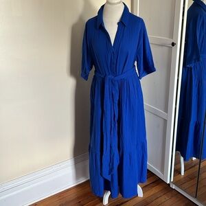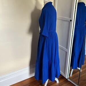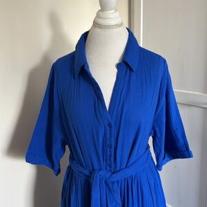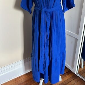 This elegant sundress by Lane Bryant features a flattering V-neckline and flutter sleeves, perfect for casual or resort wear. The midi-length design with a flowy A-line silhouette offers a comfortable fit, while the solid blue color adds versatility to your wardrobe. New without tags.