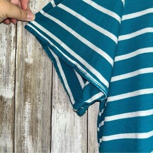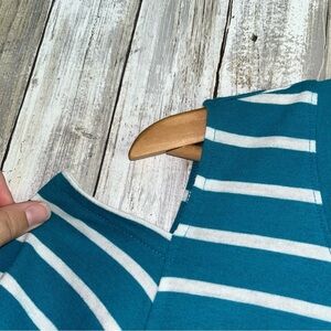 Elevate your style with this chic striped cold shoulder top. Featuring a vibrant teal and white pattern, it's perfect for any casual outing. Enjoy the comfort and flair of this must-have piece in your wardrobe.