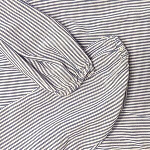 This Lane Bryant blouse in size 22/24 features a blue and white striped pattern with lace accents at the shoulder. The long sleeves and balloon sleeves add a feminine touch, while the relaxed fit and pullover closure make it comfortable and easy to wear. Made from rayon, this breathable top is machine washable and suitable for casual or business occasions. Ideal for all seasons, this blouse combines a nautical theme with a bohemian style, perfect for a variety of outfits.