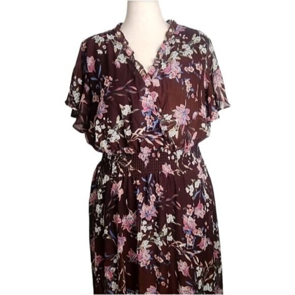 Embrace bohemian elegance with this Lane Bryant maxi dress. Featuring a charming brown and pink floral design, it offers flutter sleeves and a flattering fit in size 22/24W. Perfect for any occasion, this dress adds a touch of whimsical style to your wardrobe.