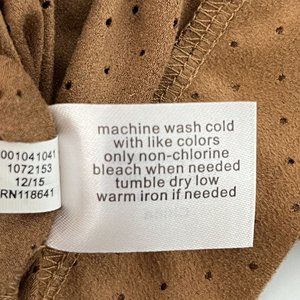 Brown top with short sleeves, split neckline and straight hem with side notches. Soft punched microsuede fabric is polyester with 10% spandex for lots of stretch. Machine washable.