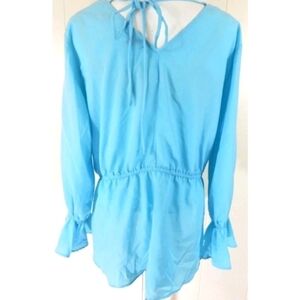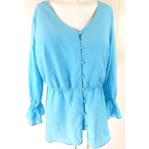 Item: Women's Blue Button Front Peplum Flare Sleeve Blouse