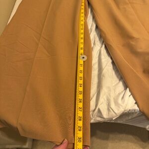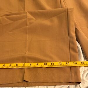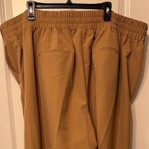 Chic neutral trousers from Lane Bryant in a rich camel color, perfect for work or dressy casual days. These wide-leg pants feature a flattering paperbag-style waist with attached self-tie belt, comfy elastic back waistband, and real pockets front and back. Fluid woven fabric drapes beautifully and moves with you thanks to a bit of stretch. Easy pull-on style with no front zipper bulk β just smooth, polished lines that look great with blouses, fitted tops, and blazers. Gently pre-owned and in nice condition.