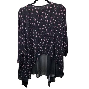 Lane Bryant Cardigan Open Front with Mesh Back Panel in Black with Pink and Green Floral Print. Soft, Lightweight Jersey Fabric. Flowy with Stretch. 96% Rayon, 4% Spandex