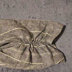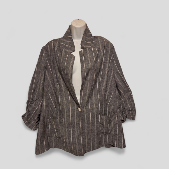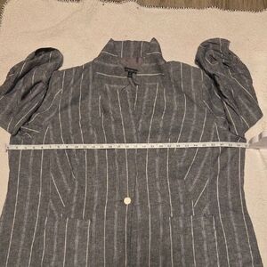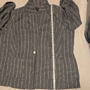 used and in great condition Elegant charcoal blazer with vertical stripes. Ideal for office wear. Features a chic, open-front design.