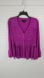 V-neck. Long sleeves with gathered cuffs. Peplum hem. Button front. Woven challis fabric. Standard length.