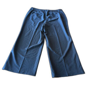 Pre-owned in excellent condition, these Lane Bryant Classic Navy Blue Wide Leg Trousers in size 20 offer a flattering, flowy silhouette perfect for casual or professional looks. No material or care tags present, but assumed easy-care fabric. Ideal for plus-size wardrobes seeking comfort and style. Faux back pockets.