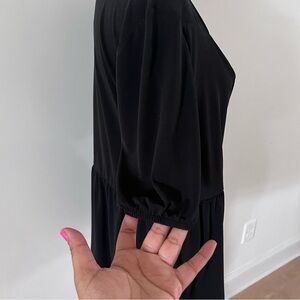Surplice sweetheart neck. Perfect sleeves are slightly longer for more coverage and total comfort. Covered elastic at the waist and cuffs. Matte jersey knit. Slightly longer length is perfect for added coverage with skinny jeans and leggings.