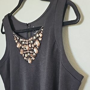 Elevate your wardrobe with this chic black sleeveless top, featuring a dazzling jewel detail at the neckline. Perfect for any occasion. Textured stretch fabric. Gorgeous blouse! So feminine and flirty but Chic and classic at the same time. A very standout top. Keyhole opening in back with single button closure. Love the contrast pinkish brownish jewels. Slightly longer in the back. Great for the office, workplace, interview, career, professional, dinner, date night. Great condition. Witchy, Sweet, Twee, Romantic, Mobwife, Statement.
