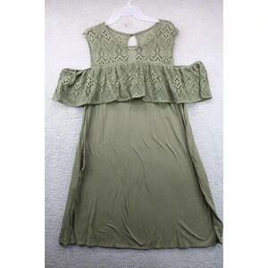 This is a Lane Bryant Cold Shoulder Dress with lace at the top. It is an olive green color. It buttons in the back. It is 95% Rayon and 5% Spandex. Laying flat, it measures: Armpit to armpit-24". The length is 39.5". In good condition.