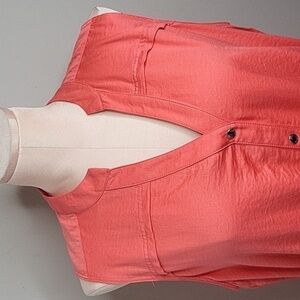 Sleeveless coral dress. Button-down front. Elastic waist for comfort.