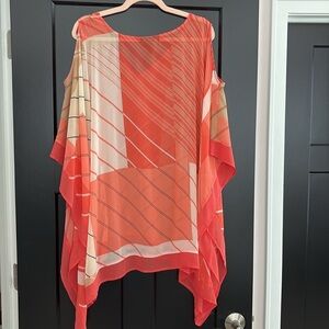 Lane Bryant (Plus Size) Coral & Cream/Off White Geometric Asymmetrical Sheer Tunic. Size 22/24. Stylish V-neck tunic with a bold geometric pattern. Flowy and elegant design. Very lightweight. This is oversized, which you’ll notice in photo with arm pit to arm pit measurement. It will fit closer to the body when worn.