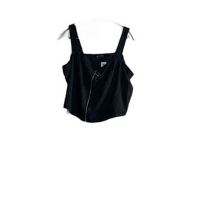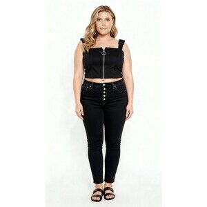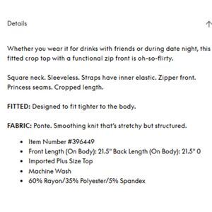 Whether you wear it for drinks with friends or during date night, this fitted crop top with a functional zip front is oh-so-flirty. Square neck. Sleeveless. Straps have inner elastic. Zipper front. Princess seams. Cropped length. *AI images are for illustrative purposes only. Model is a size 16/18, 1X/2X plus size. Please see other images for reality. Jeans not available from me.