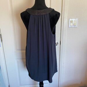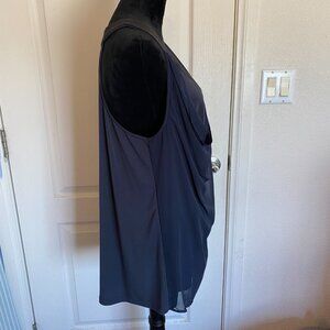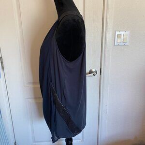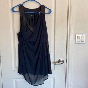 Lane Bryant SZ 18/20 chic, dark blue, dressy tank with sheer polyester overlay. Top is beautiful, dressy, worn once and in new condition, the details are stunning. Tank is a t-shirt style material making for a relaxed comfortable fit. The detailing and overlay dress it up. This is a lovely top for date night or concert night. Measurements in photos.