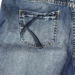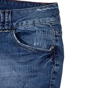 Women's red triangle right fit tech blue jeans from Lane Bryant in Dark Sand Blast. Discontinued. Factory faded and lightly distressed, high rise. Size 18 Avg. 99% Cotton, 1% Spandex. Machine wash cold, normal cycle, tumble dry low. Due to light & screen variations, colors may vary slightly from the images