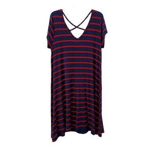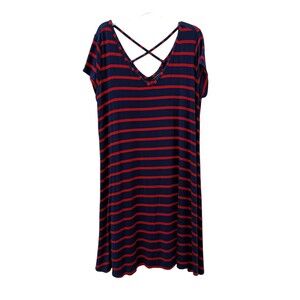 Lane Bryant Dress 14/16 1X Striped Knit Red Navy Crisscross Accent Midi Length