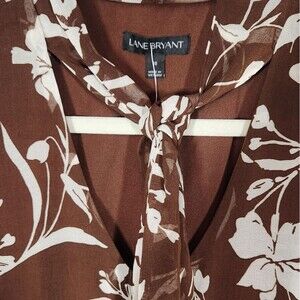 Lane Bryant Dress Retro Long Sleeve Fit Flare Chiffon Tie Neck Brown White Lined Sheer Button Sleeve Scarf Tie Neck Elastic Waist Knee Length Brown White Floral Flowy