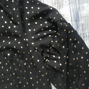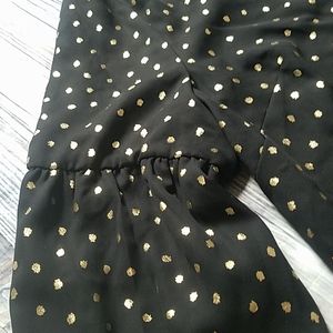 Stunning Beautiful Lane Bryant dress top !!!!! Size 16 measurements lay-flat are about armpit-armpit 25 inches & Top-bottom about 30 inches. This top is the color black with gold polka dots but there are uneven polka dots which give it a really cool look. Beautiful sleeve,arm & collar detail ! In excellent used condition !!!